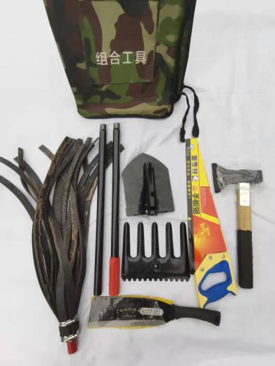 组合工具为森林防火使用最普遍的工具组有8件套,工具组内含有砍刀斧头,军工铲,五齿耙,手锯,灭火拍,两个连接杆,伸缩杆,军镐等工具,可随意组装,在扑火队员配置配定的情况下,实现一套工具多种功能,一人带工具多人使用,同时对森林防火与队员开辟隔离带,清除树枝,杂草,余火等,起到了很好的辅助作用,该组合工具除基本配置外,还可根据用户的实际需求配置不同的工具。