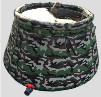 本产品材料为PVC四色迷彩夹网布(PVC复合布、PVC刀刮布)厚度均采用≥0.7mm,高强度材料制成,产品尺寸底部圆周直径≥2米,上部水口直径≥1.2米,高度加满水以后≥1米,充气直立式储水罐,上部充满气体以后不需要人工树立,加水以后可以自然站立,而且产品可以用于消防蓄水,部队户外拉练临时存水,使用方便,可折叠收纳,随用随走,简单便捷,不占用空间。